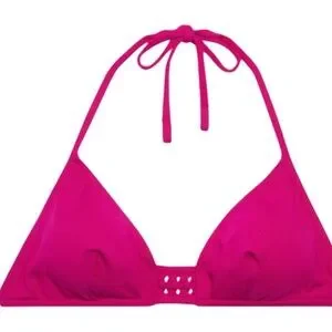 “This small triangle bikini top with an interlacing band on the front features bust darts and halter-neck ties. This pink with the intensity of a cocktail is also reminiscent of a summery raspberry sorbet. Lumi is a multi-position small triangle bikini top. It can be tied at the neck or worn with straight straps. With its central graphic detail at the front, it stylishly enhances the silhouette.”