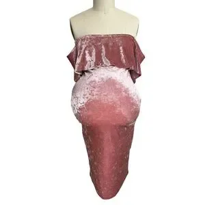 Custom Maternity Elegant Pink Velvet Velour Off-Shoulder Midi Dress Shower