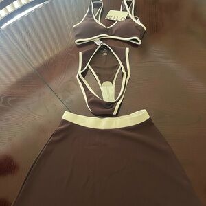 NWT XS 3 Piece Bikini w/skirt. Elegant Chocolate Color with white accents