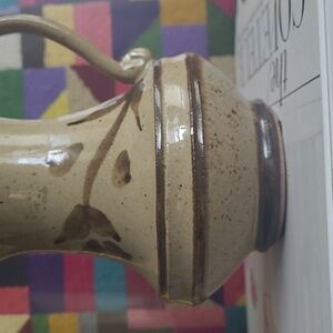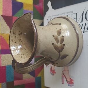 Vintage Ceramic Handcrafted Pitcher. Delicate floral design wraps around the pitcher. This piece of pottery would look great filled with flowers atop a stack of books or filled with wooden spoons. 6.5in. Height 5.5in. Width. No chips, cracks, or crazing. In excellent condition.