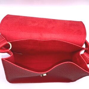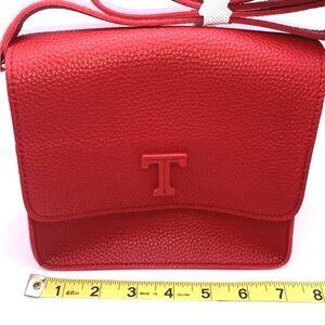 Stylish, solid red color, imitation pebble leather purse. The exterior material of the bag is PVC and is accented with gold color metal hardware. It also has an initial "T" on the front that adds a personalized touch