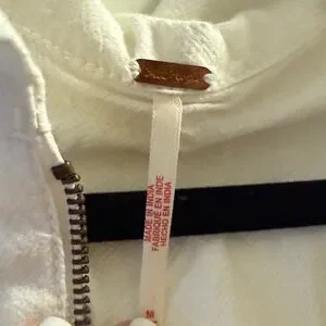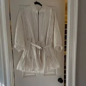 Free People white mini dress with belted detail. Balloon sleeves, collar detail with zipper. Denim-like material