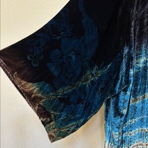 Indulge in luxury with this elegant velvet kimono robe. Featuring a stunning blend of black, blue, and orange hues, this piece is perfect for adding a touch of sophistication to your loungewear collection. Ideal for relaxing at home in style. 100% silk.