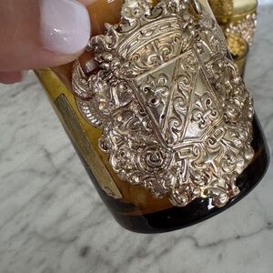 Gorgeous vintage barware set featuring an amber glass decanter with a wooden stopper and 6 matching lowball glasses. Each piece has an ornate gold-tone metal crest emblem in a royal baroque style.