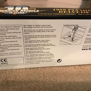 ERTL American Muscle 1958 Plymouth Belvedere 1:18 Metal Die Cast. Opening doors and hood. Opening trunk. Detailed engine. Steerable front wheels. Black exterior, white hard top. Shark fins!