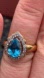 Beautiful halo style Cocktail Dinner ring. Pear cut Swiss Blue Topaz surrounded by white sapphire stones. Presidium Gem tester shows topaz and white sapphire. Stamped "925/18KGP PAJ"