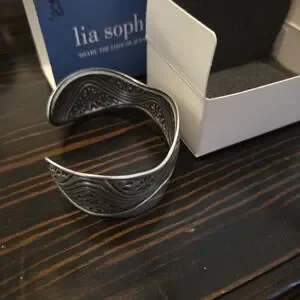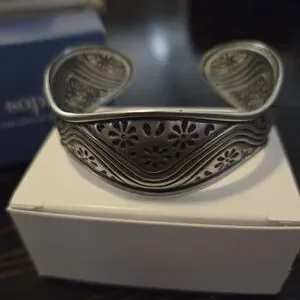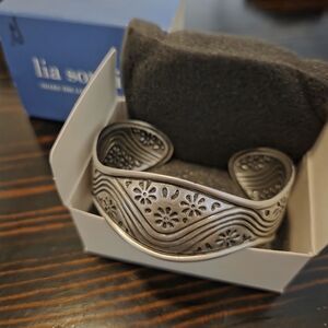Elegant silver pewter cuff bracelet with intricate floral design by Lia Sophia.