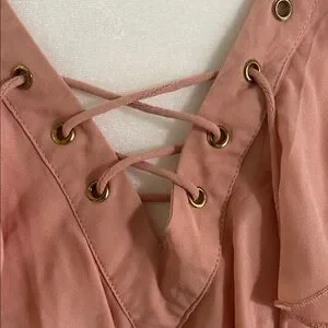 Elegant sleeveless blouse with ruffle accents. Features lace-up front and studded details. Ideal for versatile styling.