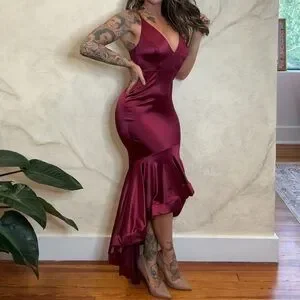 Chic burgundy dress with a high low hem. Sleek satin finish. Ideal for evening events.