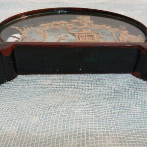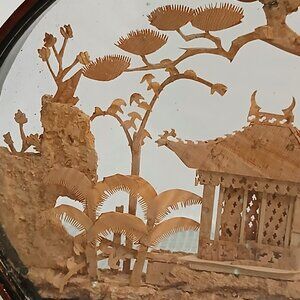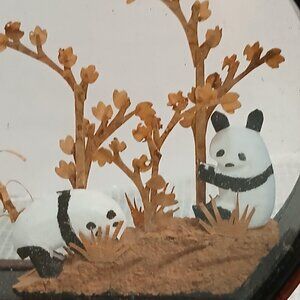 Darling, adorable, beautiful! Hand carved cork diorama with pandas in a garden. Wooden frame 6.25" tall, 7" long and 1 1/8" wide. There is some dust floating on the inside and sticking to the glass.