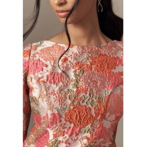 Embrace sophistication and romance in this colorful brocade mini dress, featuring a vibrant floral design and dramatic balloon sleeves, perfect for garden parties, elegant lunches, or chic date nights.