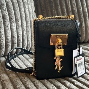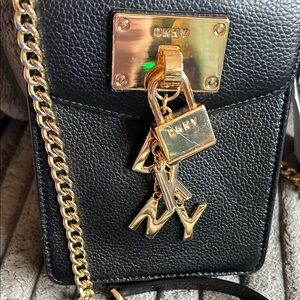 Elegant NWT DKNY crossbody bag in sleek black. Features striking gold chain, fun DKNY logo bag charm & padlock, and logo details. Ideal for any occasion.