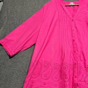Women’s Catherines Pink Cotton Blouse 2XL Button Front Eyelet Hemline 3/4 Sleeve
