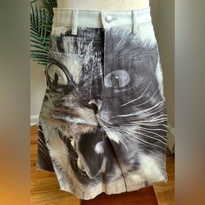 Brand new with tag attached, Tory Burch denim skirt from the Cat Capsule limited edition collection in size 6 and comes with the also very limited “cat face” shopping bag. A line skirt is made from 100% heavy cotton denim, perfect to wear with boots in the fall and winter, definitely not a lightweight skirt! The skirt is slit into a few pieces at the hem, giving it that “A” line slight flare. Button and zip fly closure, belt loops, with 2 pockets at the front and a patch pocket at the back. Part of Tory's limited-edition capsule, featuring the work of German photographer Walter Schels, whose animal portraits appear in Tory's collection. Schemes photographed Cat in 1994. The size 6 is approximately 14” lying flat at the waist, and length is 25” All hardware, including the rivets, are marked with the Tory Burch name. Comes with the limited edition Cat gift bag with twill handles. Rare piece from Tory Burch and definitely a conversation starter/piece! Definitely a great piece with the crabbiest cat on your skirt! Fabulously unique for those who want to be a bit on the edge different!