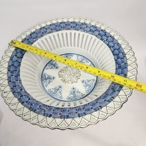 Contemporary Chinese Satsuma Blue and White Ceramic Fruit Bowl, late 20th century, the reticulated bowl hand painted blue under glaze with woven border design.