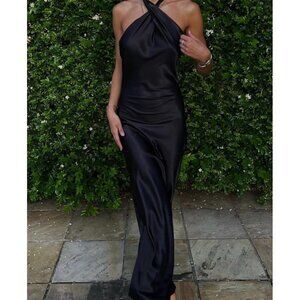LULUS Waltz with You Halter Satin Column Gown in Black Size X-Small