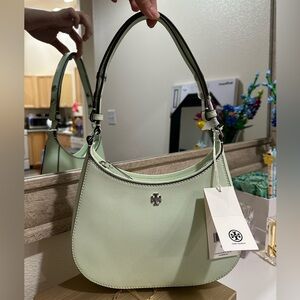 Stylish Tory Burch shoulder bag in light green. Perfect for adding a fresh touch to your look.