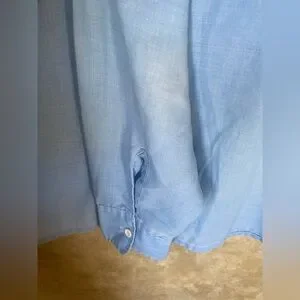 A classic button front lite blue shirt that is ready for a new home. Super lightweight and breathable. In fair used vintage condition with no major holes or tears but lots of staining throughout. Had intention of dying black but haven’t gotten around to it.