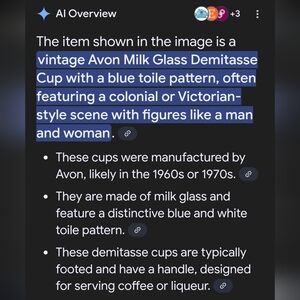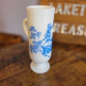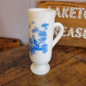 Vintage 1960s Avon milk glass dimitasse footed mug, featuring a colonial scene in blue. Perfect for serving coffee and or liquor. Excellent pre loved condition no flaws.