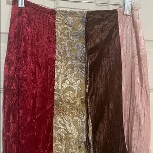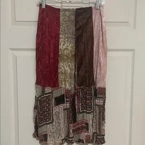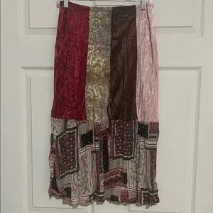 Elevate your style with this elegant patchwork midi skirt. Featuring rich tones of red, pink, brown, and cream, it's a versatile addition to any wardrobe.