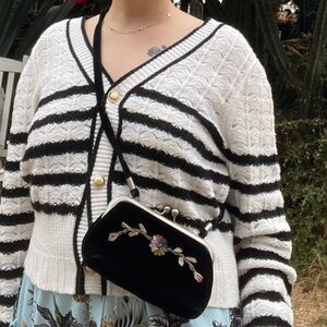 This elegant black velvet clutch features a delicate floral embroidery, perfect for adding a touch of sophistication to any outfit. Ideal for evening events or special occasions.