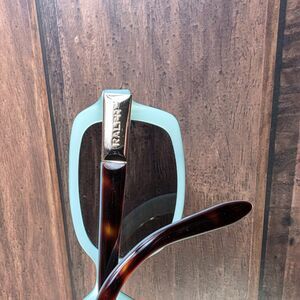 Elevate your style with these elegant Ralph Lauren women's sunglasses featuring a unique tortoise shell front frame paired with soft blue temples. The oversized rectangular design offers a chic, modern look that flatters a variety of face shapes. Crafted with durable acetate, these sunglasses combine fashion and function effortlessly.