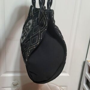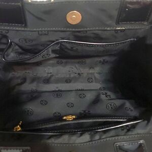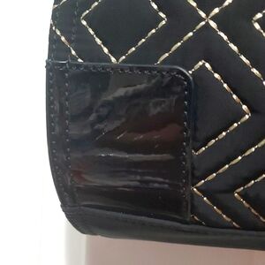 Tory Burch Ella Quilted nylon Tote black and white stitching, Trim Patent Leather and adjustable side snaps.This Tory Burch Ella tote is the perfect accessory for any occasion. The square shape and magnetic closure make it easy to carry, while the double handles and 7" handle drop provide a comfortable fit. The black patent leather handle and gold side snaps add a touch of elegance to the bag. The tote features inner pockets and side snaps, making it easy to organize your belongings. The quilted gold diamond finish and solid pattern give it a sleek look. This Tory Burch Ella tote is made of durable nylon material and is perfect for travel or casual use.