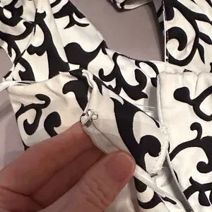 Stylish backless dress with intricate black and white design. Features a vibrant red accent. Ideal for elegant events.