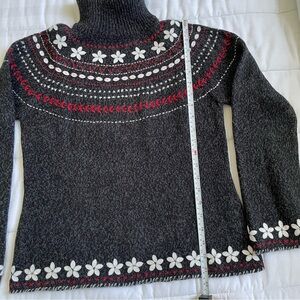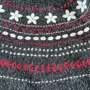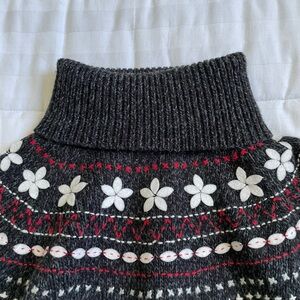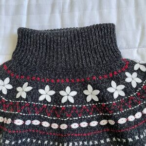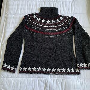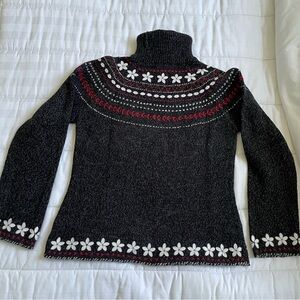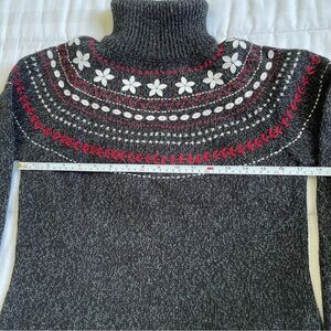 Women’s Charter Club charcoal gray and black turtleneck sweater with red and white stitched design and white felt appliqués. Size Petite Medium.