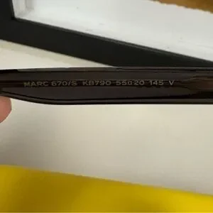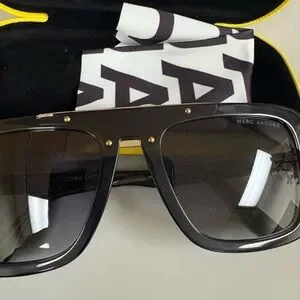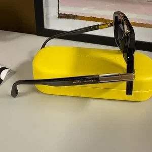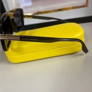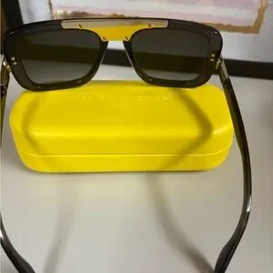 Elegant black sunglasses with gold detail from Marc Jacobs. Ideal for a modern style. Like new condition with no callouts. Comes in yellow Marc Jacob’s case with cleaning cloth.