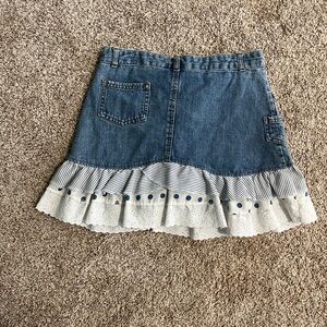 Blue denim skirt with front and back pockets, accented with embroidered flowers and butterflies. Finished with striped and polka dot ruffle layers at the hem. Full button and zip closure. Make me an offer!
