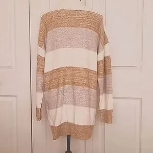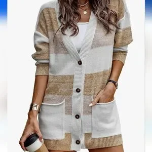 NWT, never worn. Soft, striped cardigan. Brown/tan and cream. brown buttons. Hits mid thigh 100% poly. Ready for Fall!!
