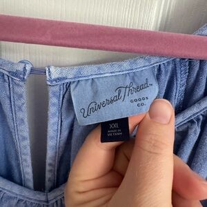 Universal thread blue romper with short sleeves. Features a drawstring waist and v-neckline. Casual and comfortable design.