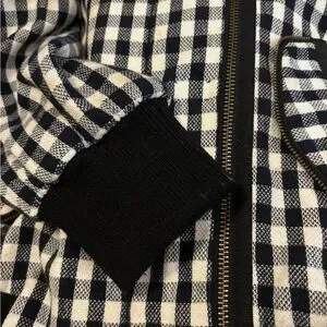 In addition to beautiful 100% cotton gingham check plaid body, this jacket features a 100% silk striped interior lining, cropped sleeves, two parallel zippers and bronze hardware. Pockets showcase a trim of piping and zipper hardware as well as grosgrain ribbon.