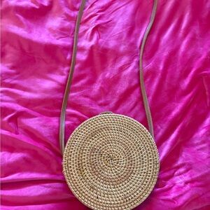Stylish and versatile, this tan woven crossbody bag is perfect for any occasion. Its unique round design adds a touch of elegance to your outfit.