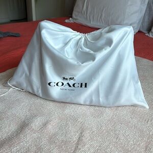 Chic Coach shoulder bag in sleek black. Features elegant gold detailing and playful cherry charm. Ideal for versatile styling.