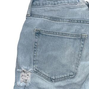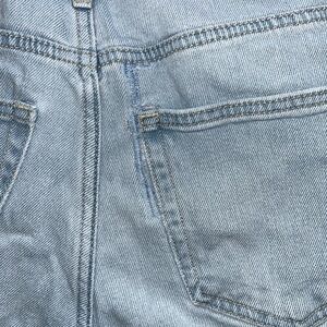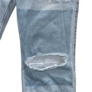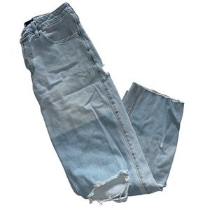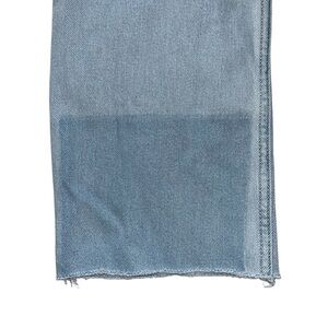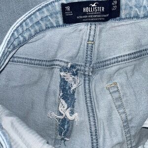 Good condition. Ultra high rise vintage straight fit. Light wash with darker colored patches. Manufacturer distressed. All pockets are real! Button fly. Size 7. Measurements are approximate: 14” waist, 25.5” inseam, 12” rise. Please note these have a mended spot on one back pocket, as pictured. Well sewn and not really noticeable.