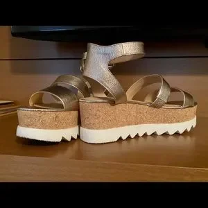 Stylish rose gold metallic sandals with a cork platform. Features adjustable straps for comfort. Perfect for casual outings.
