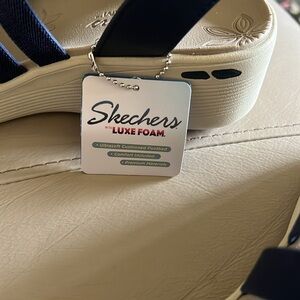 Elegant navy blue sandals with stylish straps. Comfortable and versatile for any outing. These are Skechers with Luxe Foam. Machine washable and air dry.