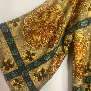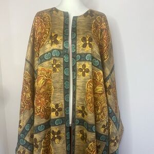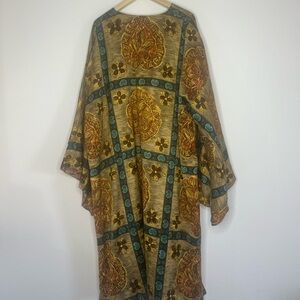Elevate your style with this elegant multicolor kimono jacket. Featuring a blend of gold, brown, and green hues, this piece adds a touch of sophistication to any outfit. Perfect for layering and versatile for any occasion. This kimono is from a vintage shop in Amsterdam. It is made of quality material but there is a stitching correction on the back left sleeve. See all photos. One size fits most.