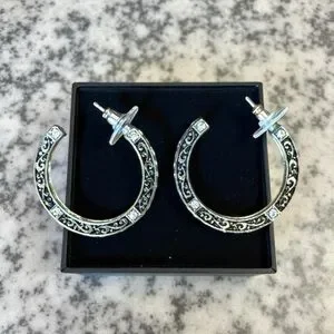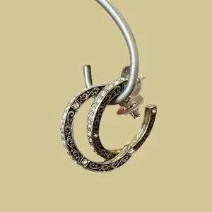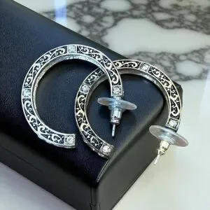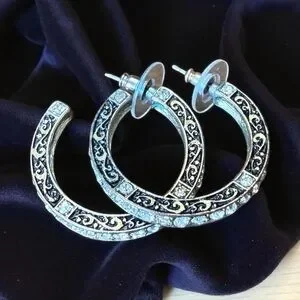 Gold-toned half-hoop earrings featuring an ornate, filigree scroll design with clear rhinestone embellishments. Clear rhinestones are set along the outer edge of the hoop, adding sparkle and embellishment. For pierced ears. All rhinestones are intact.