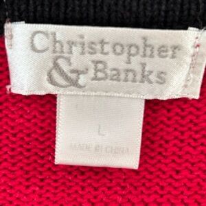 Festive red cardigan featuring holiday embroidery. Black trim and button details, last bottom button the black part is missing (see photos)!