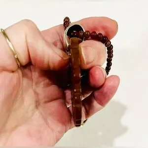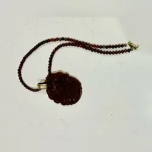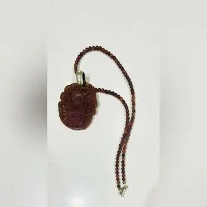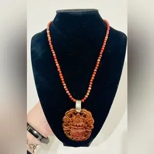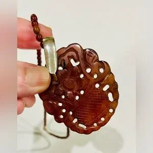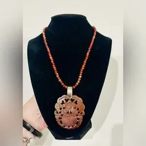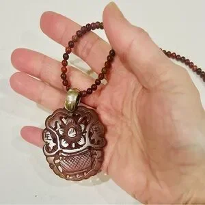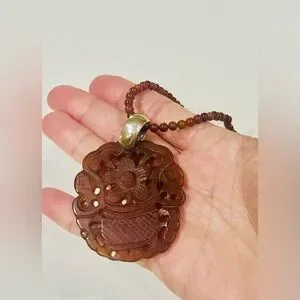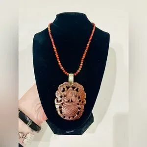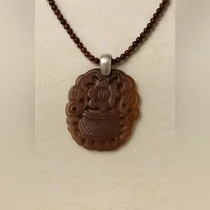 Exquisite artisan necklace featuring a hand-carved brown jade pendant with pierced floral and woven basket motifs—both deeply rooted in Chinese tradition. The flower (possibly lotus or peony) symbolizes beauty and renewal, while the basket evokes abundance and prosperity. Suspended on a strand of natural stone beads in earthy tones and finished with a heavy sterling silver bail and clasp. Approx. 18” long; pendant drop ~2.25”. Weight: 36g. A wearable talisman of cultural heritage and strength.