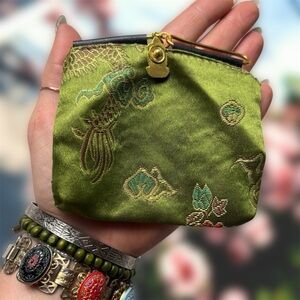 Chinese Silk Frog Pouch-Green Floral with Gold Frog Charm - Great For Small Gift