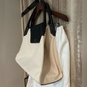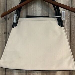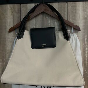 FRAME Canvas Shoulder Bag. Crème colored with black leather flap, interior pocket and straps. Gently used, there are no rips, tears or stains. Used only a handful of times. From a smoke free home. Comes with original duster.