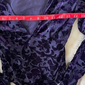 Lux purple velvet bodysuit with floral design. Features a deep V-neck and puff long sleeves. I have added some measurements because of missing size tag.💜