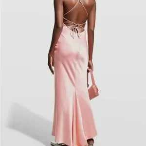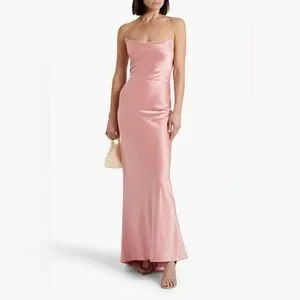 Stunning one-shoulder gown in a soft pink hue. Perfect for elegant occasions. Flattering and modern design.