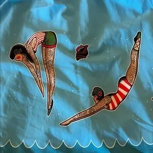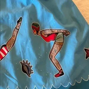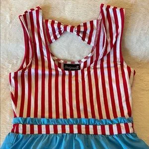 Charming dress with red stripes and a blue stripes. Features playful swimmer designs. Good used condition, minor piling on top.