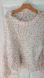 Cozy loose cable knit sweater with multicolor speckles. Distressed at neckline and hem. Cropped length. Size is S/M. See measurements. Stretches.