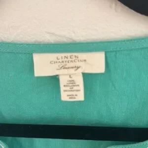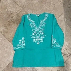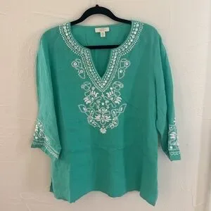 Add a touch of elegance to your summer wardrobe with this Charter Club 100% linen tunic. Featuring beautiful white embroidery and mirror detailing along the neckline and sleeves, this aqua green top offers a breezy, boho-chic look that’s perfect for warm weather.